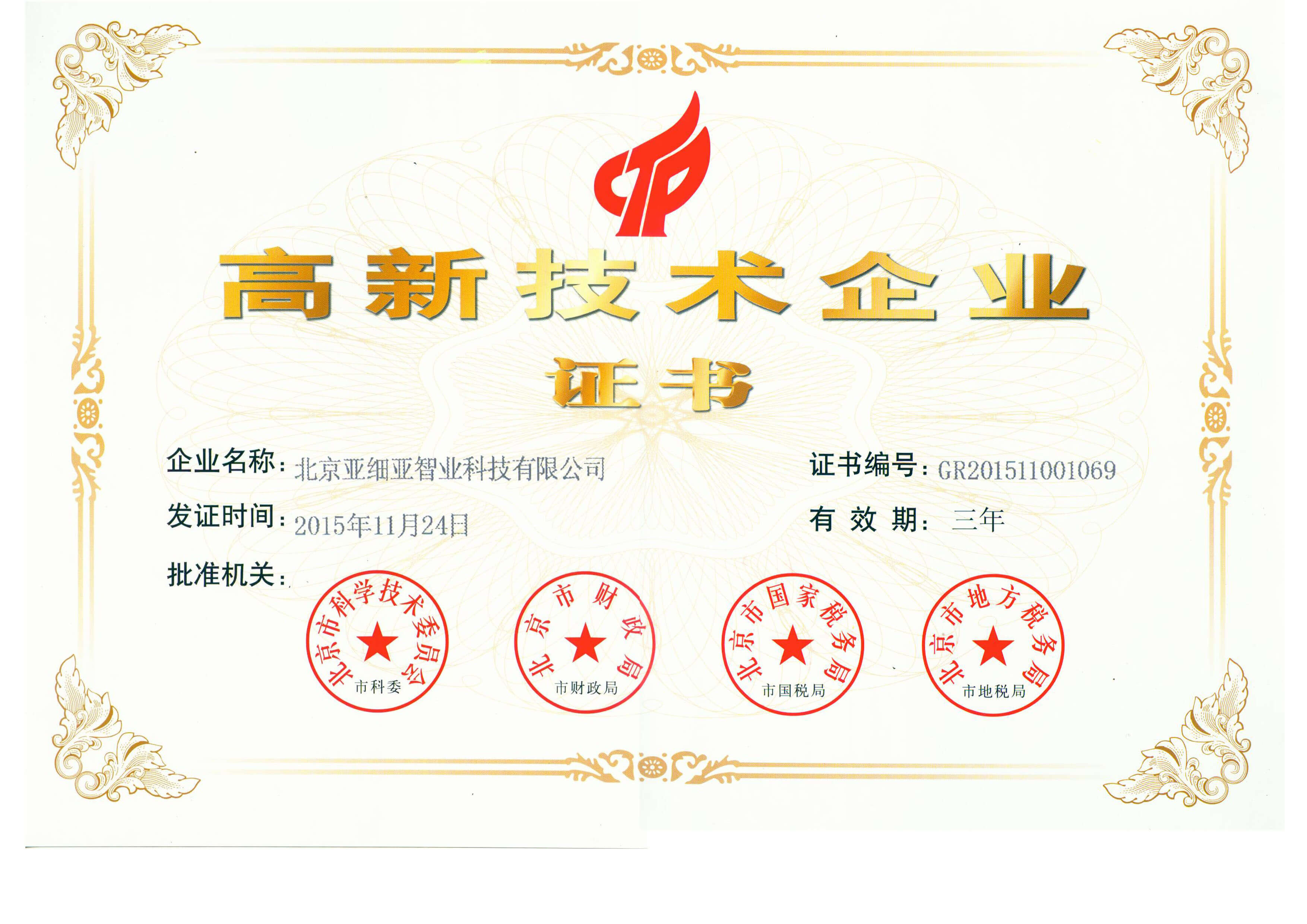 2015年高新技術企業證書